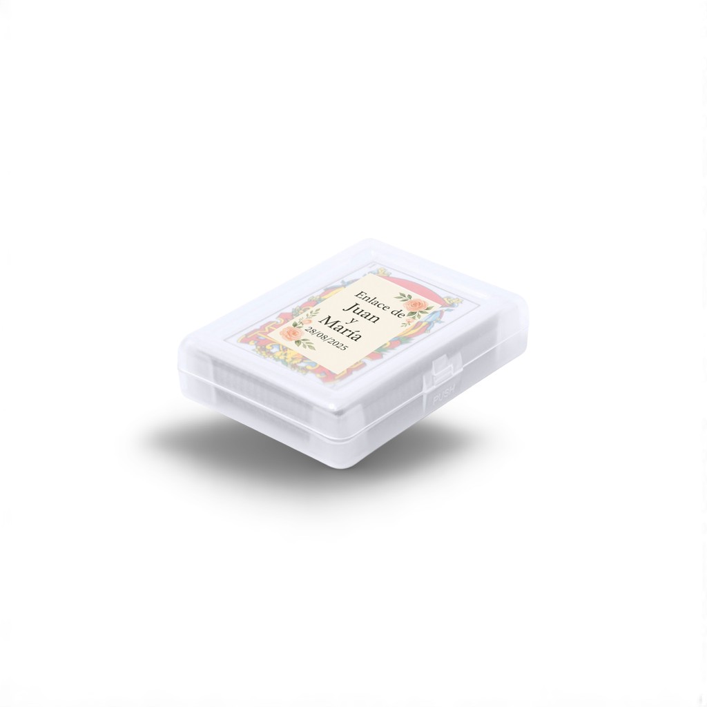 Si buscas un detalle original, práctico y con un toque lúdico para sorprender a tus invitados, esta baraja de cartas española con funda de plástico personalizada es una opción perfecta. Ideal para bodas, comuniones y celebraciones especiales, combina tradición, entretenimiento y personalización en un solo regalo.