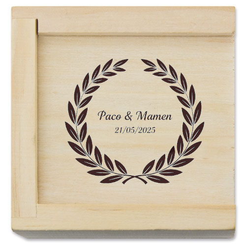 - Lado Personalizado: La otra cara está destinada a un grabado láser totalmente personalizable. Puedes inmortalizar nombres, fechas importantes, o un mensaje especial, como la elegante corona de laurel con «Paco & Mamen» y «21/05/2025» que hemos diseñado.